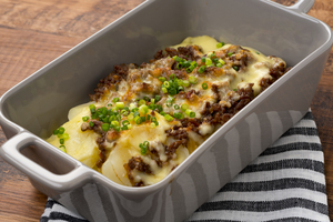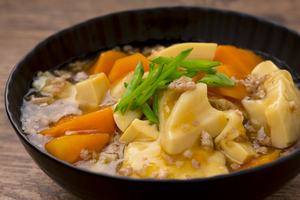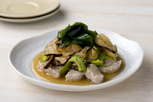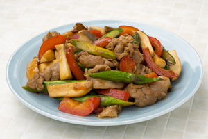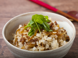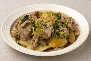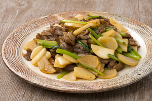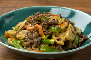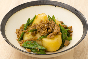 - さやえんどうを味わうじゃが芋そぼろ炒め