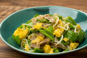 - ピーマンと豚肉のふわふわ卵炒め